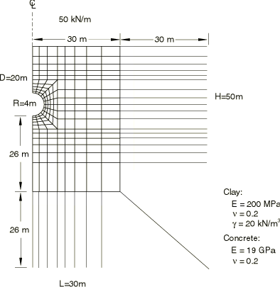 این مثال فعالسازی مجدد عنصر را برای مشکلاتی نشان میدهد که در آن عناصر جدید در حالت بدون استرس اضافه میشوند. نمونههای معمولی از فعالسازی مجدد عنصر بدون تنش عبارتند از ساخت سد ثقلی، که در آن لایههای بدون تنش از مواد به شبکهای که قبلاً تحت بار ژئواستاتیک تغییر شکل داده، اضافه میشود، یا تونلی که در آن یک پوشش بتنی یا فولادی نصب شده است.